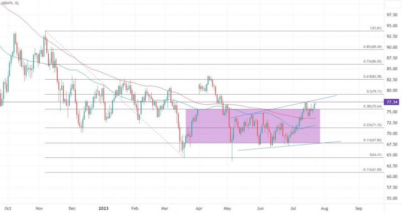 ATFX期市分析:原油获供应收紧预期提振,黑海局势对农产品价格带来支撑 7月21日收盘回顾: 美国期金收低0.2%,结算价报1966.60美元; 美国原油期货上涨1.9%,结算价报每桶77.07美元,为4月25日以来最高; 布兰特原油期货上涨1.8%,结算价报每桶81.07美元; COT小麦期货下跌4.06%,结算价报597.50美元。 原油