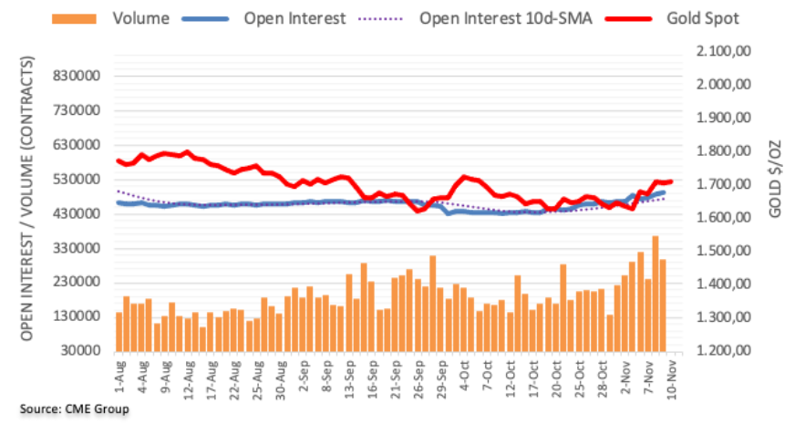 芝加哥商业交易所集团黄金期货市场最新数据显示,週三黄金未平仓合约连续第三日增长,此次增长愈0.3万份。相反,成交量下降约6.74万份合约,部分逆转此前增长。 黄金:下一上涨目标为1730美元 週三金价录得新高后收跌。价格下跌之际未平仓合约增加,可能允许金价在短线进一步调整。与此同时,金价将继续升向10