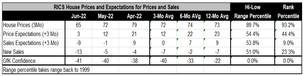 随着英格兰银行将其关键利率提高50个基点并计划压缩其资产负债表,英国房地产市场(RIC调查涵盖英格兰和威尔士)一直在对央行的紧缩政策做出反应;对未来三个月价格的预期已经失去了很多动力。该图表着眼于过去三个月的房价,并将其与未来三个月的价格预期进行比较。虽然目前的价格已经开始小幅走软,但预计未来三个月