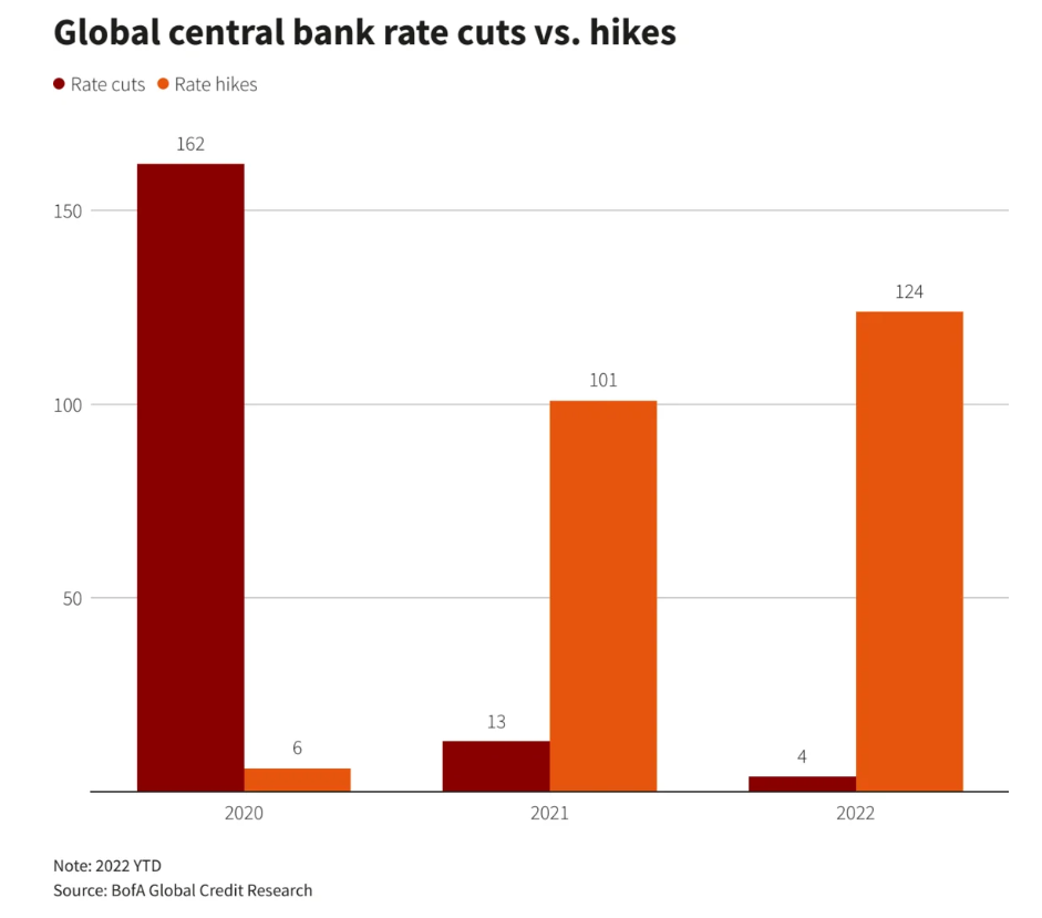 2022年迄今才过去了不到半年,但对于全球各国央行而言,过去的近六个月时间无疑已经比去年一整年都更为忙碌…… 根据美国银行全球研究(ofAgloalRarch)的数据显示,总体而言,全球央行今年迄今已累计加息124次,这一数字超过了2021年去年全年的加息次数——101次,而在疫情爆发的2020年,全球央行总计仅有6次加息