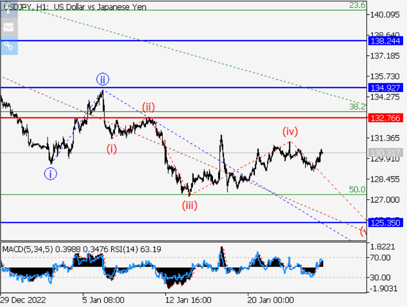 主要情景:考虑在132.76下方的修正中建立空头头寸,目标为125.35-121.52。 另一种情况:突破132.76水平并盘整将允许该货币对继续上涨至134.92-138.24水平。 货币分析:日线图上较大度数(3)向上的第三波结束发展,(3)第五波作为其组成部分形成。下降修正似乎继续发展,作为H4图上的第四波(4),(4)的波C形成作为