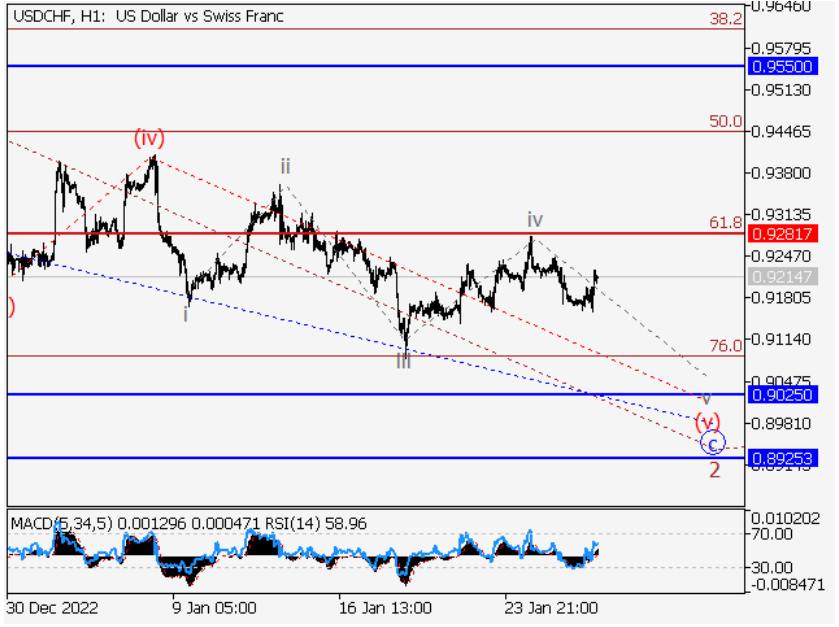 主要情景:美元兑瑞郎考虑在0.9281下方修正的空头头寸,目标为0.9025-0.8925。 另一种情况:突破0.9281并盘整将允许该货币对继续上涨至0.9550-0.9810。 货币分析:日线图上正在形成第三波(3)度较大的看涨波,(3)内形成第1波。向下修正可能在H4图上继续展开,作为(3)的波2,波2的形成作为它的一部分。在H1图上,