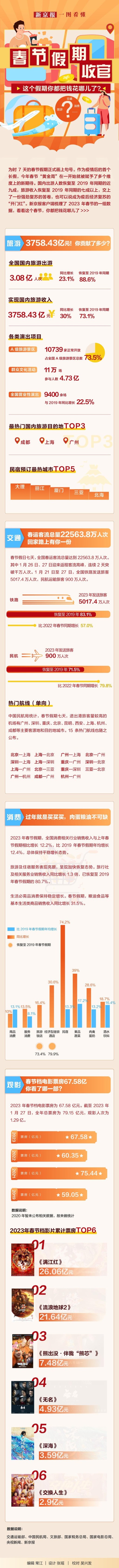 2023年春节假期,全国国内旅游出游3.08亿人次,同比增长23.1%,恢复至2019年同期的88.6%。同时,国家税务总局数据显示,全国消费相关行业销售收入与上年春节假期相比增长12.2%,比2019年春节假期年均增长12.4%…… 除了这些,春节还有啥数据?