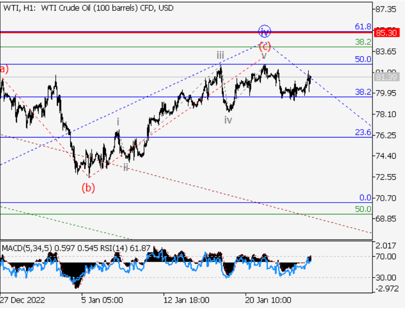 主要情景:原油考虑从85.30水平以下的修正中建立空头头寸,目标为63.00-54.50。 另一种情况:突破和盘整85.30的水平将允许资产继续上升到94.70-104.00的水平。 原油分析:大度数(1)的第一波可能在日线图上形成,熊市修正继续发展为第二波(2)。(2)的波С可能在H4图上形成,局部修正完成为内部较小度数(iv)的第四
