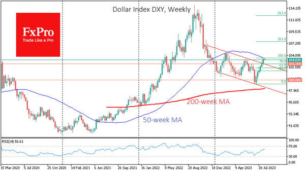Fxro的AlxKutikvich指出,美元多头最终胜出了吗?还是卖方仍有机会?答案可能要到本周末才会揭晓。 美元指数连续第六周收高,周五攀升至3月以来最高,交易点在104上方。 美元升至5月高点上方,正式打破了持续数月的下跌趋势。上周美元指数DXY从200日移动均线和之前下行通道的阻力线上稳健反弹,也预示着趋势的