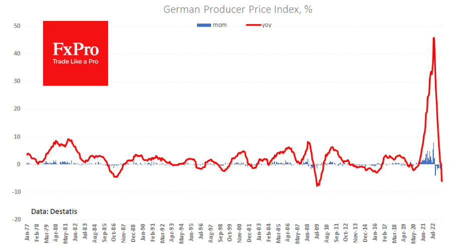Fxro高级分析师AlxKutikvich指出,德国生产者价格的大幅下跌,既是通胀压力缓解的信号,也是需求大幅放缓的警告。 德国7月份生产者价格指数下降1.1%,高于预期修正的0.1%。价格比一年前下降了6%,这是自2009年以来最大的年度跌幅。 数据展示了自6月份进口总值同比下降11.4%后,生产商降价的速度有多快。