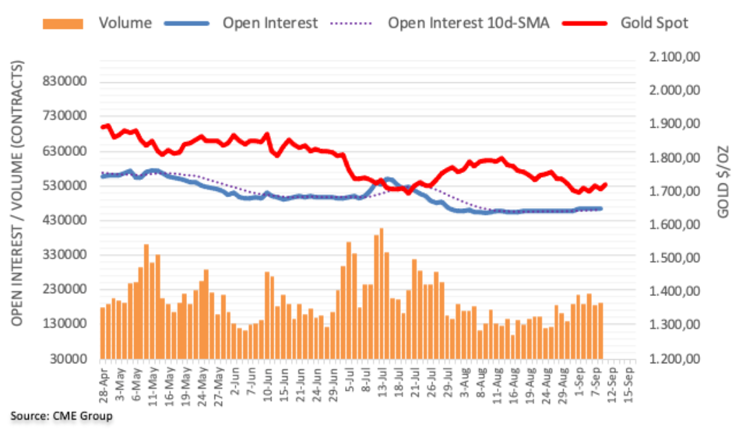 芝加哥商业交易所集团黄金期货市场的最新数据显示,周四黄金未平仓合约增长838份,逆转前一日部分下跌。成交量增长约0.66万份合约。 黄金:空头下一目标为1680美元 周四金价小幅下跌,同时处于更广泛的盘整阶段。价格当日下跌之际未平仓合约和成交量齐增,表明金价可能进一步下跌,短期目标为2022年低点1680