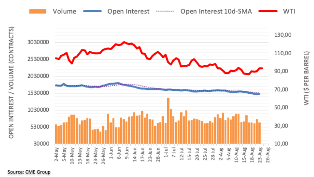 芝加哥商业交易所集团原油期货市场最新数据显示,周二交易员增持原油未平仓合约1.24万份左右,结束六连降。另一方面,成交量下降约9.77万份合约,部分抵消此前增长。 WTI原油:目标继续指向95.00美元/桶 周二WTI原油期货价格大涨,同时未平仓合约增长。油价似乎将进一步上涨,短期内要注意的下一个目标为95美