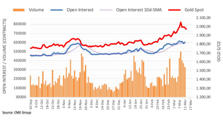 根据芝加哥商业交易所集团最新数据,上周五黄金期货市场的未平仓合约增长约1.57万份,逆转此前跌势。另一方面,成交量连续第三日下降,此次下降近4.4万份合约。 金价将再度测试1900美元/盎司 周五金价下跌之际未平仓合约增加,打开了短线进一步下跌的大门。金价料进一步下跌至1900美元(3月1日录得的月度低点