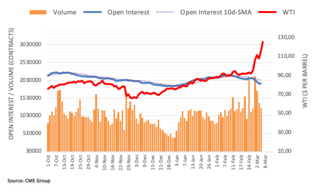 考虑到芝加哥商业交易所集团原油期货市场逐步数据,上周五交易员再度削减其原油未平仓合约,此次削减近1.2万份合约。成交量下降约13.55万份合约,连续第三日下降。 WTI:下一站月球? 地缘政治冲突推动WTI原油期货价格上周五走高。不过未平仓合约和成交量下降,打开短线调整的大门。指标严重超买也强化该观点