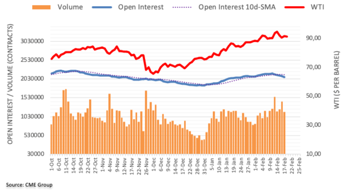 芝加哥商业交易所集团原油期货市场的最新数据显示,周四交易员削减其未平仓合约1.73万份左右,连续第五日下降。与此同时,成交量下降近27.4万份合约,结束两日增长。 WTI原油:初始支撑位于88.50美元附近 周四WTI原油小幅上涨之际未平仓合约和成交量齐跌,允许价格继续回落修正,近期可能指向88.50美元区域。