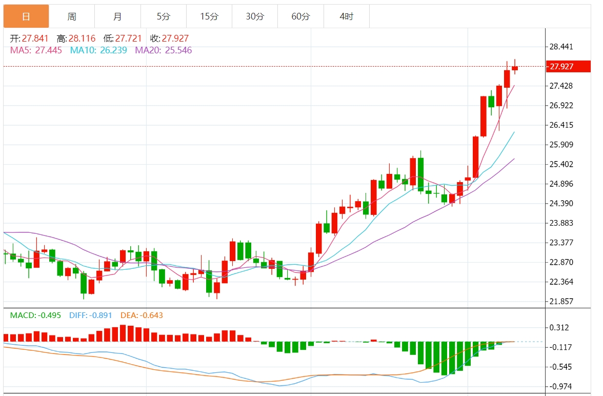 白银价格连续第三个交易日上涨,周二欧洲早盘走高至每盎司28.00美元附近。白银价格的飙升反映了在消费者和工业需求增加的推动下黄金的反弹。全球央行增加黄金储备也促进了对贵金属的需求增加。 白银市场基本面分析 随着美国国债收益率在连续两天上涨后修正,对白银等非收益资产的需求得到提振。目前,美国国