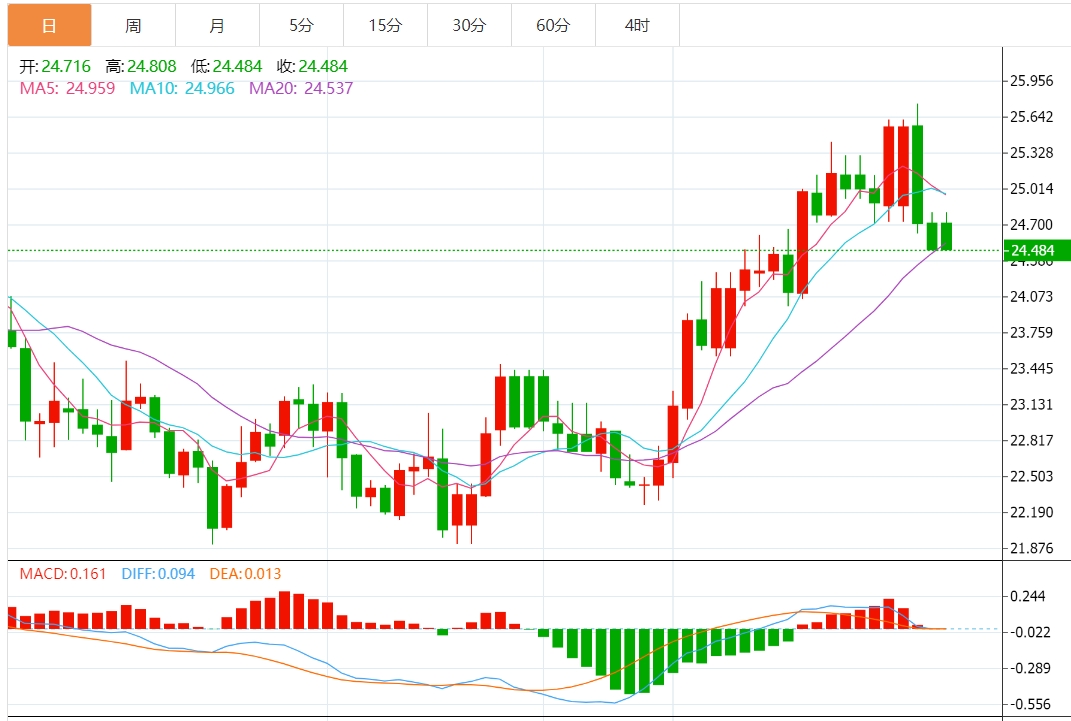 周五亚盘,白银走低,现报24.48附近,日内下跌0.91%。技术分析显示,尽管最近出现了“黄金交叉”,但看跌吞噬模式对交易者来说是喜忧参半的信号。 市场基本面分析 目前,交易商预计美联储将在6月开始降息的概率为72%,高于利率决议前的65%。据C“美联储观察”:美联储5月维持利率不变的概率为93.1%,累计降