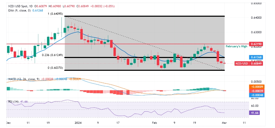 周五欧盘,纽元/美元横向波动,倾向继续2月23日开始的连跌走势。截止发稿,纽元/美元在0.6090附近徘徊,略低于心理价位0.6100的直接阻力。技术上,该货币对可能会在23.6%斐波那契回档位0.6124和9日指数移动均线 纽元/美元价格分析:在收复日内跌幅后位于0.6100下方 技术日图显示,若突破0.6100心理价位,纽元