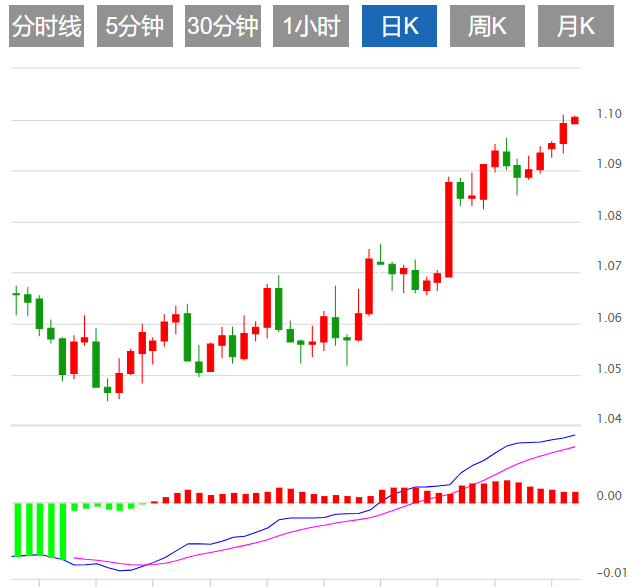 得益于美元下跌,欧元/美元在周三欧市早盘连续第五日上涨。目前汇价交投于1.1001附近,日内上涨0.12%。 欧元/美元短线交易策略 从技术面看,由于价格位于日图上50和100日A均线上方,其看涨前景不变。值得指出的是,日图上50A均线即将升破100A均线,可能印证看涨交叉,表明其上涨阻力最校 短期阻力水