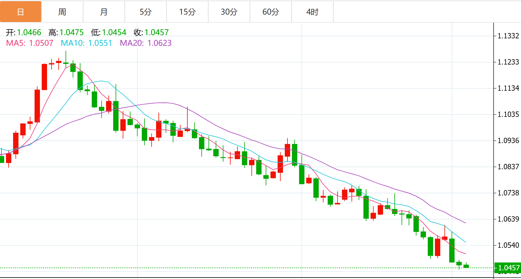 周五欧盘,欧元(UR)兑美元(UD)维持卖出倾向不变,促使欧元/美元(UR/UD)盘初在1.0600附近创下六个月新低点。 市场动态:欧元跌至1.0600附近的新低 衡量美元兑一篮子主要货币走势的美元指数(DXY)成功摆脱了周四的膝跳走势,重拾升势至105.60附近。联准会(FD)周三的鹰派表态重振了美元北上的势头,而