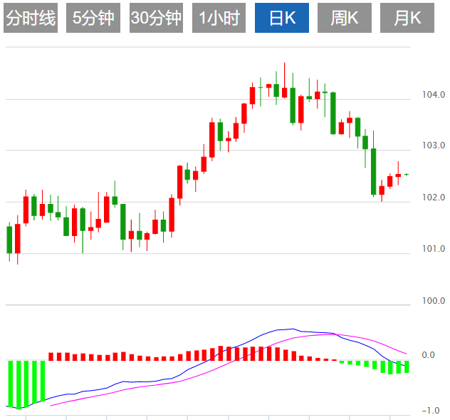 外汇市场走势分析 周一亚盘,美元指数窄幅震荡,目前交投于102.77附近。上周五美元指数一度升至103.17的高点,最后收涨0.45%,报102.86,此前全球企业活动数据疲软带来风险厌恶情绪,而且各国央行的鹰派言论增加了风险较高货币的压力。 日内投资者需要关注的重点数据:德国6月IFO商业景气指数,英国6月CI零售销售