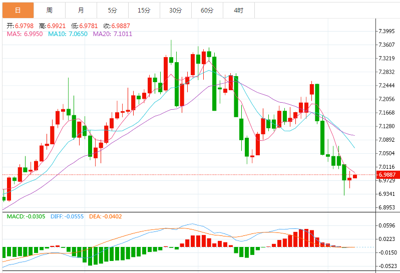 周三亚盘,美元/离岸人民币录得两连涨,处在6.9870附近,延续周初自三个月低位反弹的势头。也就是说,离岸人民币继自8月至10月上行趋势的61.8%斐波位反弹后,温和上涨。 技术上,尽管美元/离岸人民币自关键斐波回撤位(也被称为黄金比例)开始反弹,提振多头,但相对强弱指标(14)看跌且ACD指标看跌,也在打压汇价。