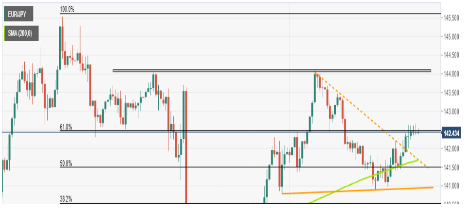 欧元兑日元继续盘整,汇价在周四欧洲时段早盘小幅下跌至142.40附近。该交叉盘在前一日确认突破看涨三角形,但9月12日至26日期间跌势的61.8%斐波回档位位于142.50附近,挑战汇价短期上行。 即便如此,14天相对强弱指标上升且汇价成功交投于200A均线上方令欧元兑日元多头充满希望,除非汇价位于141.70的支撑汇合