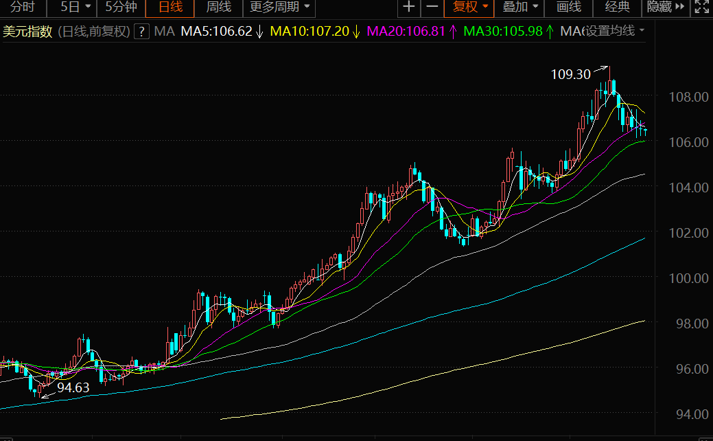 美元指数周二在106.50附近延续盘整格局。截止发稿,美元指数下跌0.09%,至106.39。稍后关注美国消费者信心指数和住房数据。 美元指数关注FOC和经济数据 截至周二,美元指数已连续第四个交易日下跌,不过在周三FOC重要会议召开前的谨慎气氛中,该指数似乎在106.00附近区域获得良好支撑。 事实上,美联储周二将