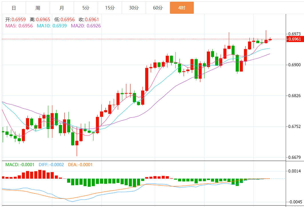 周二亚盘,美元指数承压,澳元/美元盘中拉升,目前交投于0.6975附近。风险情绪的积极转变削弱了避险的美元,并为风险敏感货币澳元提供了一些支撑。 基本面分析 尽管如此,在对全球经济低迷的担忧中,任何有意义的上涨似乎仍然难以实现,这应该会抑制市场的任何乐观走势。投资者可能也会避免大举押注,而倾向于等待