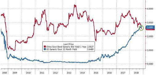 据外媒报道,中国1年期国债收益率上周五报2.611%,略低于1年期美国国债收益率2.684%,这是两者利差十余年来首现倒挂!而2017年年初时,中国国债收益率还比美国国债高出两个百分点。