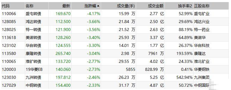 中证转债指数收盘跌0.1%,成交额413.9亿元;盛屯转债跌超4%,鸿达转债、特一转债、美诺转债、华自转债和康隆转债均跌超3%,淮矿转债、“19华菱EB”等7只债券均跌逾2%;赛意转债涨超5%,双环转债和凯发转债均涨超4%,苏试转债、艾华转债等5只债券均涨逾3%。