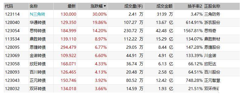 中证转债指数午盘涨0.1%,“N三角转”涨30%,华通转债涨超19%,两只债券均盘中临停;思特转债涨超14%,鼎胜转债涨近9%,恩捷转债和金诺转债均涨超6%,正元转债涨近4%;精达转债跌超6%,金禾转债和彤程转债均跌逾5%,蓝晓转债跌逾4%。