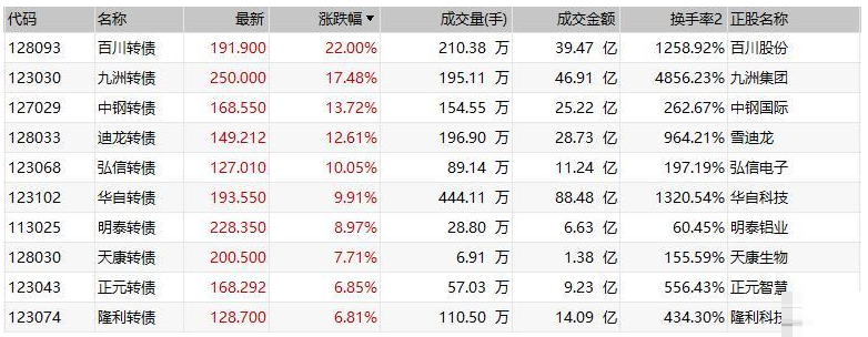 中证转债指数收盘涨0.67%,成交额777.11亿元;百川转债涨22%,盘中临停;九洲转债涨超17%,盘中二次临停;中钢转债涨超13%,迪龙转债涨超12%,弘信转债涨超10%,华自转债涨逾9%,明泰转债涨逾8%;久吾转债跌超4%,火炬转债、“星源转2”、鼎胜转债和精达转债均跌逾3%。
