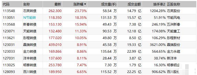 中证转债指数午盘涨0.47%,石英转债涨超23%,“N节能转”涨超18%,两只债券均盘中临停;新春转债涨近16%,天能转债涨超11%,彤程转债涨超10%,晶瑞转债涨近9%,金力转债和洋丰转债均涨逾8%;中天转债跌近12%,天铁转债跌超8%,道氏转债跌逾5%。
