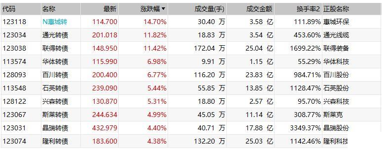 中证转债指数午盘跌0.57%,“N惠城转”涨超14%,鼎胜转债涨超3%,两只债券均盘中临停;通光转债和联得转债均涨超11%,华体转债涨近7%,百川转债涨超6%,石英转债和兴森转债均涨逾5%;三力转债跌超13%,灵康转债跌超7%,小康转债跌逾6%。