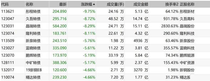 中证转债指数午盘跌0.03%,彤程转债跌超9%,久吾转债、晶瑞转债和隆利转债均跌超8%,新泉转债、蓝晓转债、鹏辉转债和中矿转债均跌逾5%,精达转债跌逾4%;蓝盾转债涨超16%,赛意转债涨超15%,华锋转债涨逾10%。