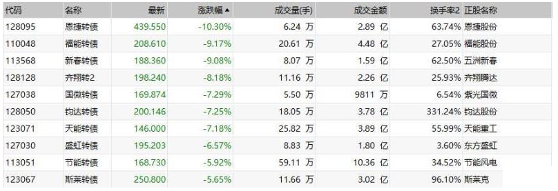 中证转债指数午盘跌0.17%,恩捷转债跌超10%,福能转债和新春转债均跌超9%,“齐翔转2”跌超8%,国微转债、钧达转债和天能转债均跌逾7%,节能转债跌近6%,斯莱转债和“九洲转2”均跌逾5%;清水转债涨超12%,奥瑞转债涨超10%,聚飞转债涨逾8%,华钰转债涨逾6%。
