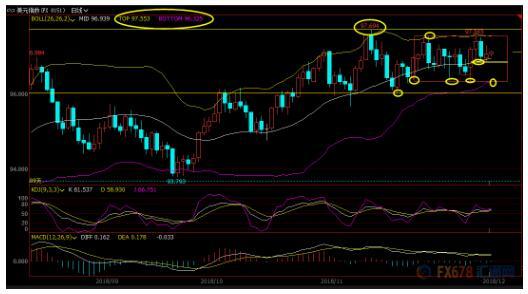 ÈÕÏß¼¶±ð£ºÕðµ´£»MACDºÍKDJÐźÅÄ£ºý£¬»ã¼ÛÔÚ²¼ÁÖÏßÖй츽½üÅÇ»²£¬¶ÌÏß×ßÊÆ±äÊý½Ï´ó£¬Ä¿Ç°²¼ÁÖÏßÖйìÐøÈý¸ö½»Ò×ÈÕ¸ø»ã¼ÛÌṩ֧³Å£¬ÔÚÊ§ÊØ¸ÃÖ§³Åǰ£¬¶ÌÏßÂÔ΢ƫÏò¶àÍ·£¬¸ü¾«È·µÄλÖÃÔÚ96.85¸½½ü£»ÉÏ·½¼ÌÐø¹Ø×¢²¼ÁÖÏßÉϹì97.55¸½½ü×èÁ¦£¬ÈôÉÏÆÆ¸ÃλÖã¬ÔòÓÐÍû´ò¿ªÐµÄÉÏÕǿռ䣬¶ÌÏß11ÔÂ13Èոߵã97.69¸½½üÒ²´æÔÚһЩ×èÁ¦¡£