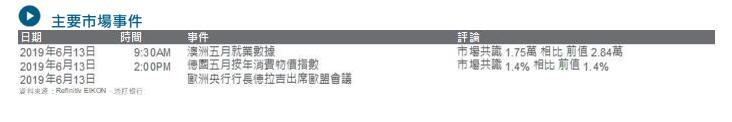 美元周三收复早市因美国消费物价温和而导致的失地,市场焦点现转向至美国联邦公开市场委员会于6月18至19日举行的会议之上。美国 消费物价按年升1.8%,低于预期的1.9%;核心消费物价则按年升 2.0%,同样低于市场预期的2.1%。早前美国公布的就业及制造业数 据偏软,市场虽然未预期美国联储局下周会议上减息,但其会后声明 备受关注,因早前联储局主席鲍威尔发表了偏鸽言论。联邦基金期货 显示七月有约八成机会减息(以及截至2019年年底前至少减息两 次),同一时间,美国总统特朗普再次批评利率 “太高”,以及联储 局 “一无所知”。