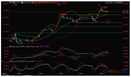 日线级别:震荡后初步上破;MACD金叉,KDJ金叉,汇价初步顶破了97.14-98.00的震荡区间,在失守100日均线97.92前,短线偏向震荡上涨;初步阻力在98.20附近;然后是10月16日高点98.42附近,较强的阻力在10月15日高点98.65附近,10月9日低点阻力在98.89附近,布林线上轨阻力目前在99.17附近。