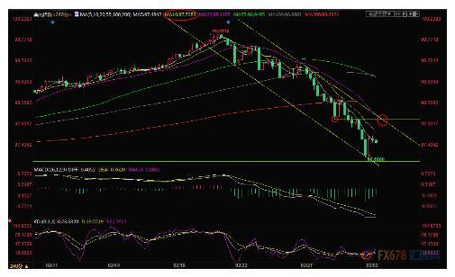 4小时级别:单边下跌;但汇价目前跌至下行通道下轨附近,KDJ低位金叉,K线低位“看涨吞没”,需要提防温和反弹的可能性,10均线阻力目前在97.73附近,然后是98整数关口阻力,下行趋势线阻力也在该位置附近,若能顶破该阻力,则增加后市看涨信号。