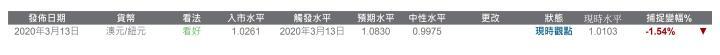 英伦银行宣布措施后,英镑兑美元弹升,其后却逆转升势。我们注意到英伦银行将其政策利率下调了15个基点,并重启购买债券。除了持 续的美元资金压力外,英国脱欧和新型冠状病毒的不确定性仍然困扰 英镑气氛。2016年低位1.1450仍然是备受关注的水平。