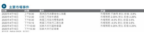 随着美国企业开始公布业绩,美元兑一篮子货币下跌。风险资产因为投资者关注报导指一些国家正在考虑放松封锁而表现强劲。 但是,国际货币基金会最近发布的四月全球经济展望却明确预期2020年全球经济可能会收缩3%。我们认为有关企业盈利与经济的辩论将会在本周余下持间持续。