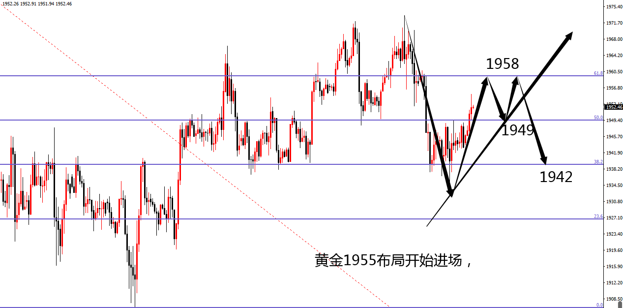 因为行情在周三是布局黄金上位1955或者说1958和60之上,但是一度的下跌测试了黄金分割点位的38.2一线1932见底翻转收线在50之上,的确是没想到啊!在此位置也看到反弹了,这波的压力位置在1940一线,结果就这样结束了空头开始走了多头趋势,你说气人不气人!1920的目标位置又要等待上方高空,非要我进行一波布局的大利润,生气!