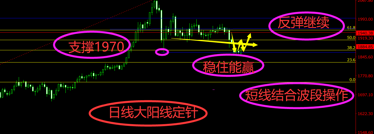 技术面:黄金日K线超级大阳线昨日收底,前期几个交易日金价有过横盘,这种情况只要支撑到位,很容易起来,并不属于日线强势大跌,收单阳线那种,。而是定义为反弹上升趋势,所以操作上,前期黄金2000美元下方布局的所有空都已经完美收割,最后一张空1865损后,激进者短线开多走起。