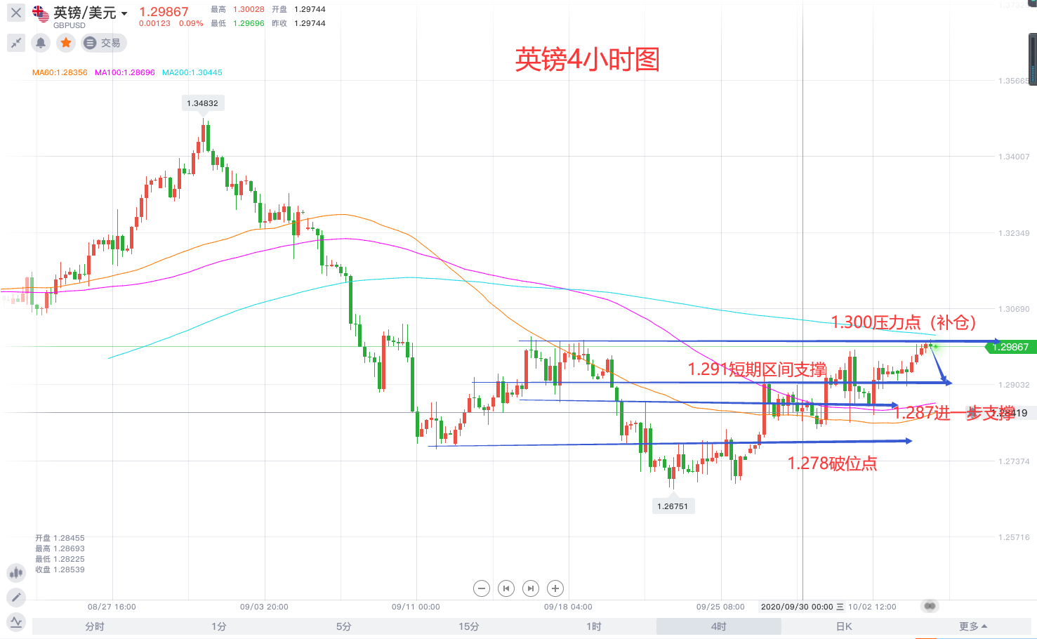 交易方面,1.300补仓入场的,可以暂时先行撤离或进行推保护,1.291附近入场的可继续持有,关注下方1.287的破位。