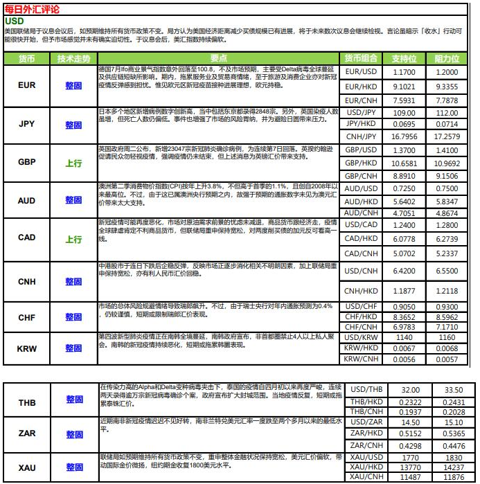 美国联储局于议息会议后,如预期维持所有货币政策不变。议息声明指,通胀虽然升温,但主要只是反 映暂时性因素,整体金融状况保持宽松。又重申将会维持现时利率水平直至充分就业及通胀有望一段时 间内适度超过 2%目标。而尽管 Delta 变种新冠病毒可能对经济增长构成威胁,但局方认为美国经济距 离减少买债规模已有进展,将于未来数次议息会继续检视。言论虽暗示「收水」行动可能很快开始,但 予市场感觉并未有确实迫切性。于议息会后,美汇指数持续偏软,并回落至 92.2 水平。