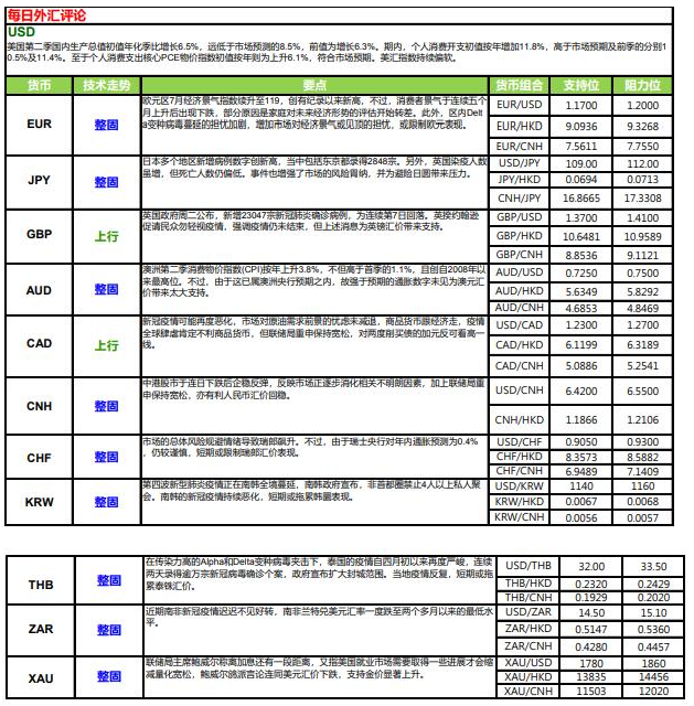 美国第二季国内生产总值(GDP) 初值年化季比增长 6.5%,远低于市场预测的 8.5%,前值为增长6.3%。数据或反映通胀飙升、供应链中断,以及劳工短缺等因素,正抑制当地经济增长。期内,个人消费开支初值按年增加 11.8%,高于市场预期及前季的分别 10.5%及 11.4%。至于个人消费支出核心 PCE 物价指数初值按年则为上升 6.1%,符合市场预期,但增幅远高于前季修正后的 2.7%。