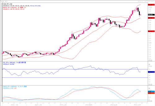 随着全球经济衰退的担忧继续困扰市场,瑞郎回升、央行意外加息和股市下挫主导了周四的交投活动。瑞士央行周四意外升息50个基点 ,加剧了对日本央行将调整政策的猜测,因为全球央行目前都在匆忙抑制失控的通胀。瑞郎、日元这些传统避险资产在隔夜外汇市场上均发力兑美元产生不俗的反弹。美元兑日元在周四(6月16日)全日跌幅1.23%,盘中最低抵达131.49。虽然有上述消息的影响,但更大程度上看也仅是日元近期大幅走弱过程中的一种调整而已。从宏观面上看,分析界仍认定日本央行维持宽松政策不变。日本央行行长黑田东彦和其他央行官员已在多个场合公开表示,日央行将维持目前的宽松货币政策立场,因为近期的成本推动型通胀上升将是暂时的,而日元疲软有利于整体经济。与此同时,随着美日国债息差急剧扩大,料日元无走强的理由。从日线图上看,各项技术指标出现拐头,显示美元兑日元的获利调整尚要延续,下方就要看5月下旬美元兑日元启航走升的水位127.00-130.00区域的支撑。若能撑持在130.00之上,则美元兑日元后市仍可期盼攀向高位。