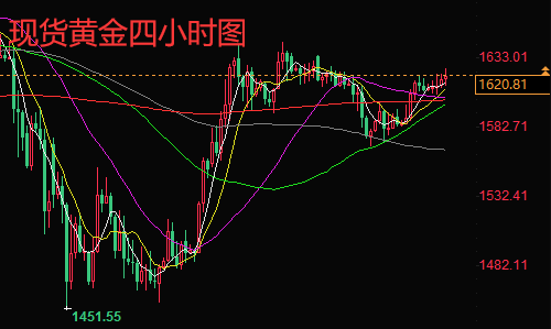 现货黄金从4小时来看,区间震荡;金价近期维持在1575-1645区间震荡,若该区间不能突破,可维持高抛低吸,或是等待决定性突破指引。上方方面,先关注上方1630美元一线,这是布林带上轨处,对价格上行有一定阻力,上破后重点关注1645美元一线,这是震荡区间的上轨,此前经过多次测试,具有较强的参考价值,若上破,进一步打开上行空间,阻力位上看前期高点1703。现货黄金目前MACD金叉,KDJ随机指标略偏向下,指示黄金短线可能继续小幅回落。若金价失守1600关口,将增加短线看跌情绪,关注下方1570美元附近。该点位是100均线与布林带下轨交汇处,同时也接近1451.55-1645.00上涨趋势38.2%回撤位,有较强支撑性,下破后料跌至50%回撤位1550美元一线,同时也是此前测试的支撑阻力位。综合来看,下周一短线操作思路上陈文龙个人建议以回调做多为主,反弹高空为辅,上方短期重点关注1628-1630一线阻力,下方短期重点关注1604-1606一线支撑。