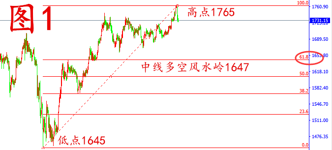 2、从今年3月份的低点1450到昨天高点1765这个区间一共315个点,按照孙老师之前给大家说到的,在上涨趋势中,只要没有回踩整体的1/3,就不要轻易判断开始反转了,用斐波纳奇回调线来看,中线只要回踩不破1645美元关口多头不会改变(道理一样)图1非常清楚。