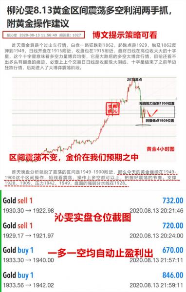 金价如我们预期,我们周四收获也颇丰,就其中一位实盘鞥有来看,午后在1930附近给到达的空单美盘时间顺利在1921附近自动止盈利出;而后金价开始反弹上升,顺势在1933附近布局多单,最终在1942收割利出!