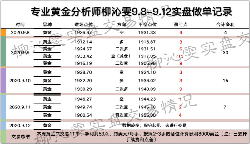 上周的交易还是比较的保守的,可以看到上周五因为数据的影响我们去选择不交易,成功的避免了一些不必要的损失,这也是主要得益于周初交易的还是不错的,一周交易11单,盈利了59个点,稳健获利,是沁雯的交易风格了。