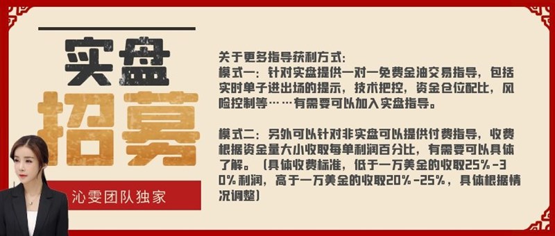 针对实盘提供一对一免费金油交易指导,包括实时单子进出场的提示,技术把控,资金仓位配比,风险控制等……有需要可以加入实盘指导。另外可以针对非实盘可以提供付费指导,收费根据资金量大小收取每单利润百分比,有需要可以具体了解。(具体收费标准,低于一万美金的收取25%-30%利润,高于一万美金的收取20%-25%,具体根据情况调整)